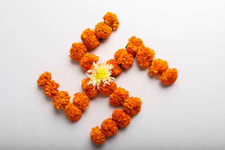 stock photo of hindu auspicious symbol called swastik made using marigold flower/zendu/genda phool