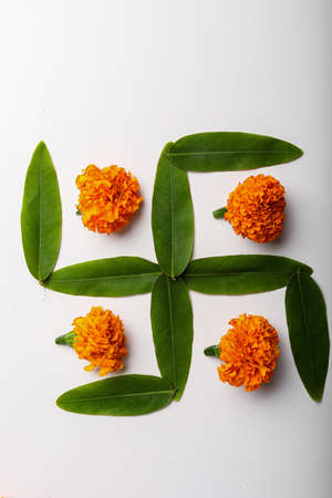 Marigold Flower rangoli Design with green leaf for traditional Festival.