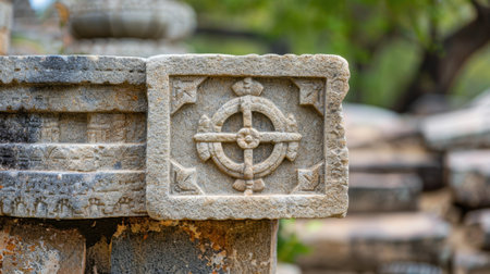 This image showcases an intricate stone carving featuring a symbolic design on ancient temple architecture, reflecting cultural heritage and craftsmanship.