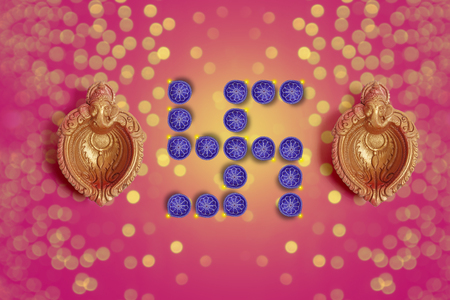Happy Diwali - Clay Diya lamps lit during Dipavali, Hindu festival of lights celebration.oil lamp diya on wooden background