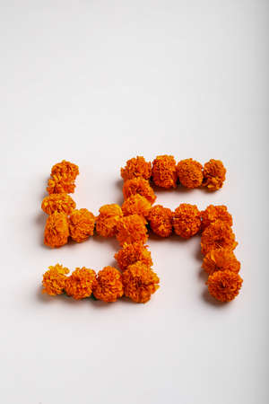 stock photo of hindu auspicious symbol called Swastika made using marigold flower or zendu or genda phool, Flower rangoli in the shape of Swastika for diwali/pongal/onam over white background