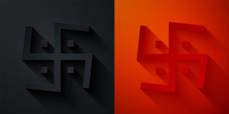 Paper cut Hindu swastika religious symbol icon isolated on black and red background. Paper art style. Vector
