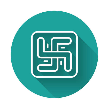 White line Hindu swastika religious symbol icon isolated with long shadow. Green circle button. Vector