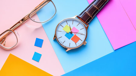 Bright and colorful flat lay of a stylish watch and eyeglasses positioned on vibrant paper. Perfect for themes of creativity, design, and lifestyle.