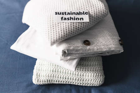 ethical brands and fair trade concept, pile of clothing with Sustainable Fashion label