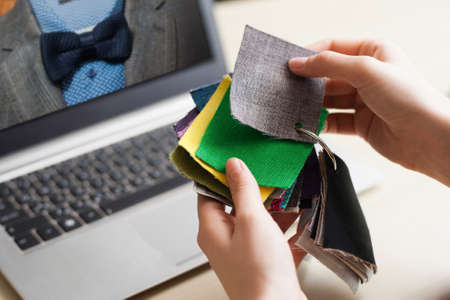 Close-up of unrecognizable female dressmaker sitting at table and viewing color swatches while choosing color for dress