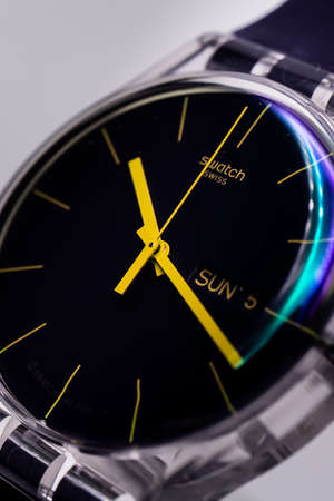 New York, NY, USA 07.10.2020 - Swatch logo on black wristwatch dial of swiss made quartz watch close up. transparent plastic case Fluorescent colors. day and date Sunday 5, youth hipster style watch.