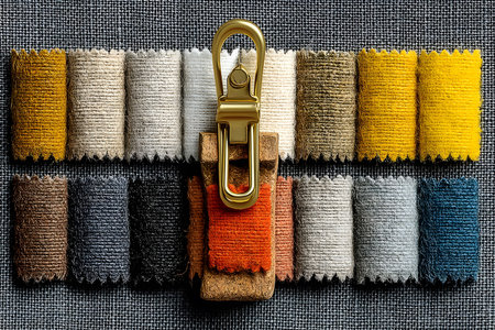 A diverse array of textile swatches arranged in a rectangular formation showcases various textures and vibrant colors, complemented by a gold zipper centerpiece. ideal for fashion designers and interior decorators seeking inspiration for color palettes and material selection. Generative AI