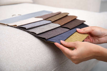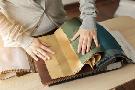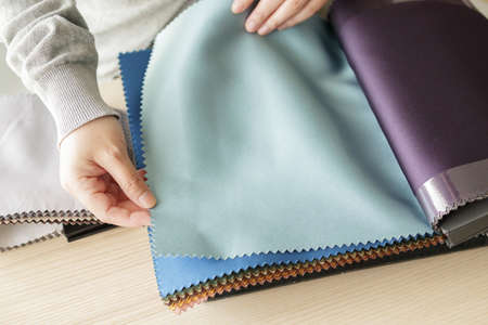 Choosing upholstery fabric color and texture from various colorful samples in a store. Female customer hands touching textile.
