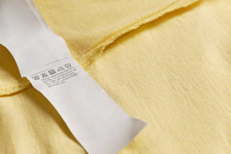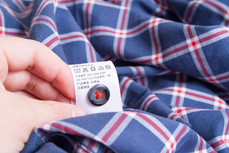 Close-up capture of a woman checking the care label of showing washing Instructions with symbols.