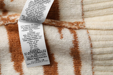 Clothing labels on knitted garment, top view. Space for text