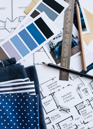 Interior designer's working table, an architectural plan of the house, a color palette, furniture and fabric samples in blue color. Drawings and plans for house decoration.
