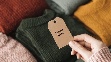 Sustainable fashion: hand holding second hand tag with colorful sweaters in background.