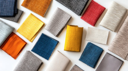 A flat lay of various fabric swatches in different colors and textures, arranged in a harmonious palette on a white background.