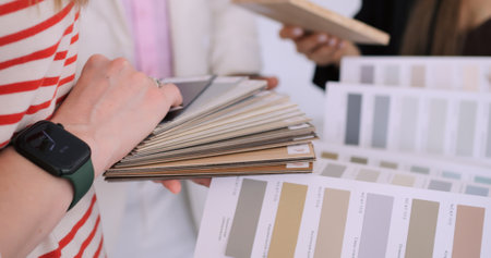 Hands of female designer in office working with colour samples. Woman at workplace choosing colourful swatches, close-up. Creative people concept