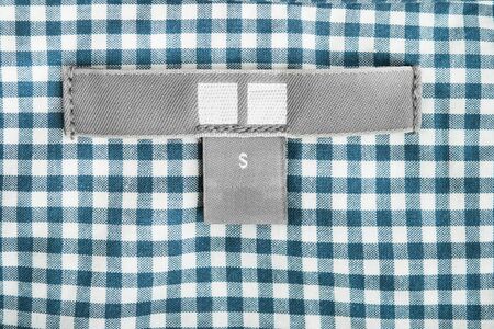 Blank gray clothes label on blue plaid cloth as a background