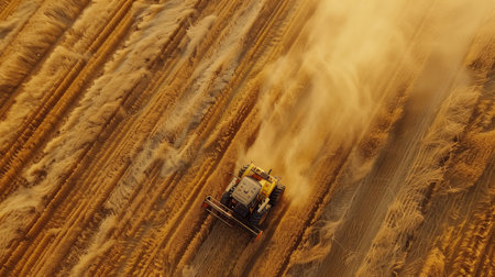 A powerful harvester works diligently in a golden wheat field, creating clouds of dust as it moves through the crop at sunset, illuminating the landscape.