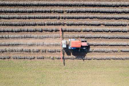 Rural landscape aerial view of a village on a field with plantings of vegetable crops, plowing hilling the soil in rows using agricultural machinery and red tractor