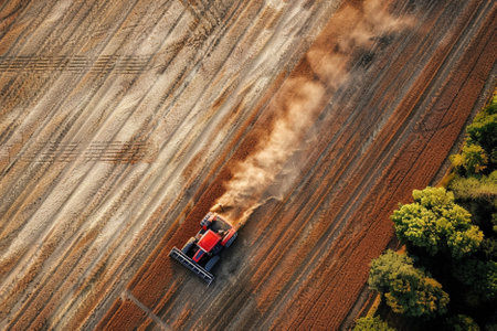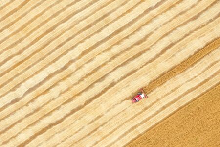Red tractor is harvesting a golden wheat field, creating lines in the crops