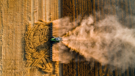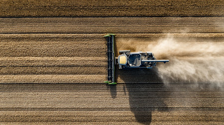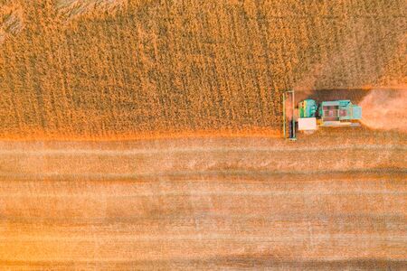 Above top view over agricultural harvester, combine as he cutting and harvesting mature wheat on farmland. Harvest time in summer