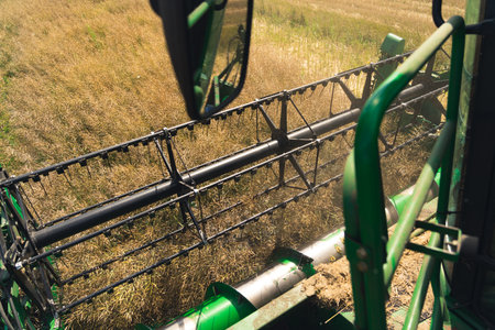 Modern agriculture concept. Combine harvester operators perspective of the reel. Rapeseed harvesting. Summertime. High quality photo