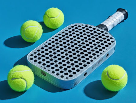 Gray paddle pallet featuring black holes and a white handle, placed among bright green tennis balls on a vivid blue surface, creating a lively sports scene