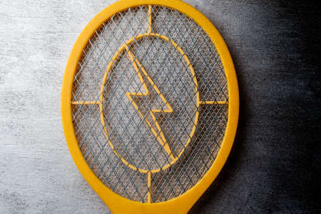 Electric fly swatter. A device for fighting flying insects in the form of a racket. Close-up. The concept of the fight between light and darkness.