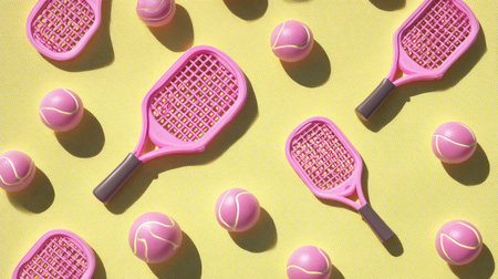 Flat lay design featuring multiple pink tennis rackets and tennis balls arranged on a vibrant yellow surface. The image presents a playful and colorful design. The arrangement of the objects creates a visually appealing pattern, suggesting a focus on design aesthetics rather than a specific sporting activity.