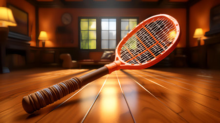 Tennis racket on a wooden floor in a living room. 3d rendering