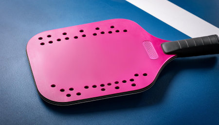 This dynamic image showcases a paddle resting on a vividly colored sports court, emphasizing bright colors and clean lines. Perfect for promoting active lifestyles.