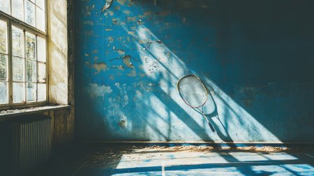 An atmospheric scene of an abandoned indoor sports court features dusty blue walls, a lone racket, and sunlight casting dramatic shadows through a dirty window.