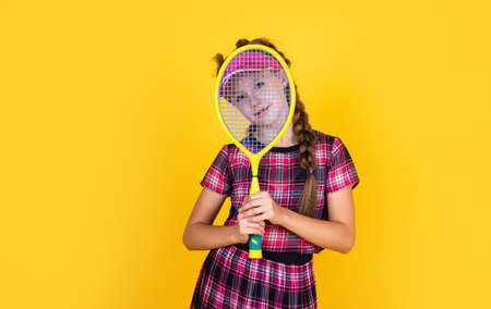 Relaxing after training. happy girl holding sport equipment. kid hold tennis racket. child wear fitness cap. childhood activity. healthy way of life. be energetic. badminton player with racquet