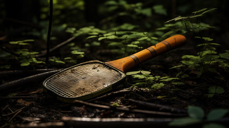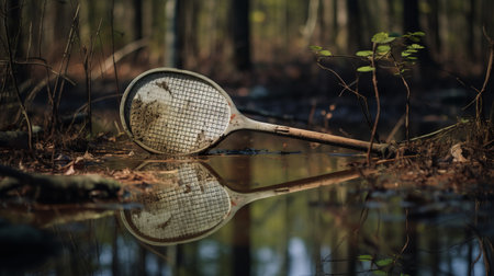 a tennis racket lies submerged in water amidst a forest, evoking a post-apocalyptic atmosphere. this image combines elements of the great depression, barbizon school, mushroomcore, emotive portraits, non-representational art, and dusty piles. ai generated