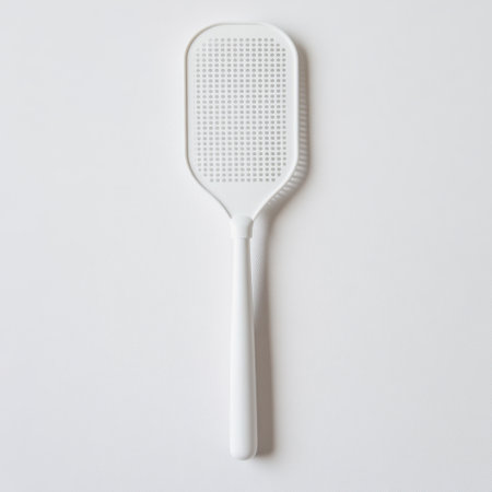 A fly swatter rests on a clean surface, showing its perforated plastic head and handle, ideal for eliminating flying insects in any indoor space.
