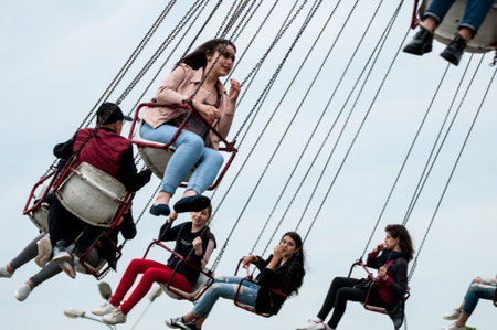 Amusement park attractions. Group of people having fun on a swing.