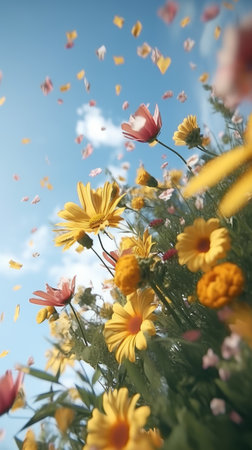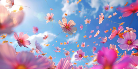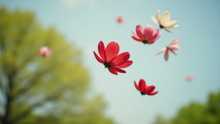 Delicate and bright flowers fall gracefully from the sky. beauty and wonder of nature. Petals gently fall in the air. Sense of freedom and natural beauty. Generative AI
