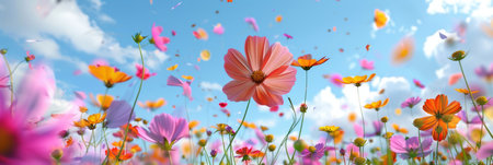 blue sky. Colorful cosmos flowers on a background of summer landscape. nature