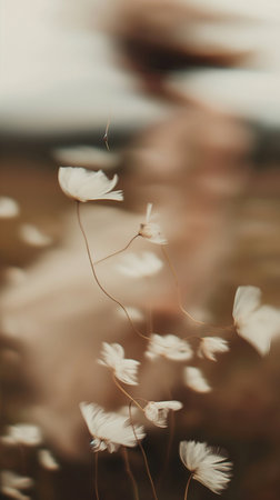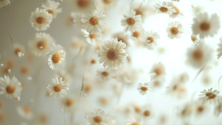 Image of numerous small white daisies with light brownish-yellow centers, appearing to float in the air against a soft, light background. The flowers are in various stages of movement, creating a sense of ethereal lightness and gentle motion. The overall aesthetic is delicate and serene.