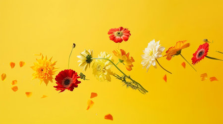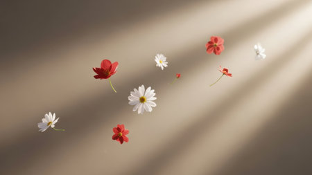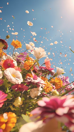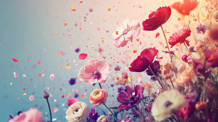 Mixed seasonal flowers gently raining down against a gradient background, evoking freshness and celebration