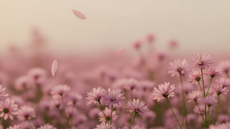 Pink daisy field in soft sunset light, falling petals, romantic floral background
