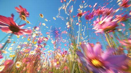 A dynamic low-angle view of colorful wildflowers blurred by movement, conveying a sense of wind-swept motion under a clear blue sky.