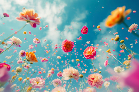 petal flowers confetti falling from a bright blue sky on an autumn or spring professional photography