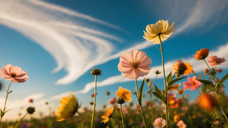 AI Generated. Vibrant Flower Field with Blue Sky and Clouds