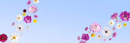 Floral summer autumn banner with flying flowers on a blue background. Floral Greeting card for Happy Mothers Day, happy Easter, happy birthday.