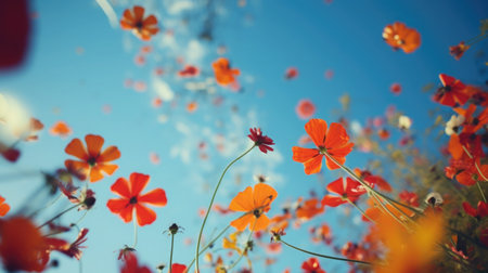 Vibrant orange flowers blooming in a field under a clear blue sky with blurred background in abstract photograph