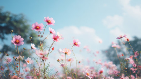 A captivating scene of blooming cosmos flowers in a spacious field, showcasing delicate pink petals against a tranquil blue sky, surrounded by lush greenery.