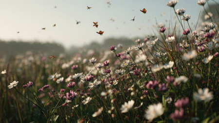 Close-up view of blooming wildflowers across a vast meadow, with butterflies hovering gracefully and bees working among the blossoms in crisp detail.