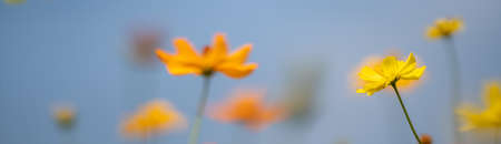 Closeup of yellow Cosmos flower with blue sky as background under sunlight using as background natural flora landscape, ecology cover page concept.