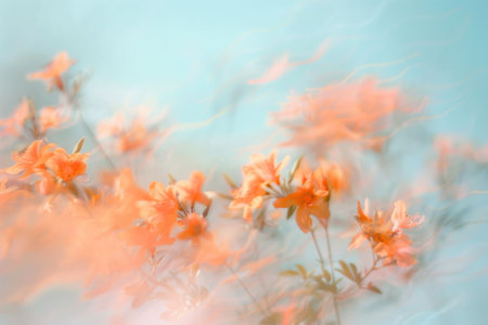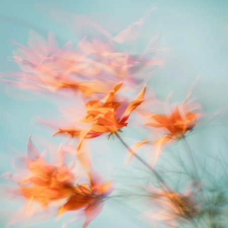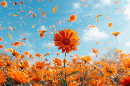 Abstract Orange Flowers Floating in Air with Blue Sky Background Vibrant and Serene Floral Composition with Natural Beauty
