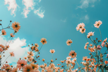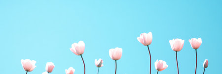 Pink flowers blooming against a pastel blue sky creating a beautiful and romantic atmosphere, perfect for valentines day, mothers day, or spring celebrations